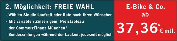 monatlich 37,36 Euro bei 40 Monatsraten; keine Anzahlung; 3,99 % effektiver Jahreszins (enthält Provision und Bearbeitungsgebühr), gebundener jährlicher Sollzinssatz 3,9 % bei 40 Monaten Laufzeit.